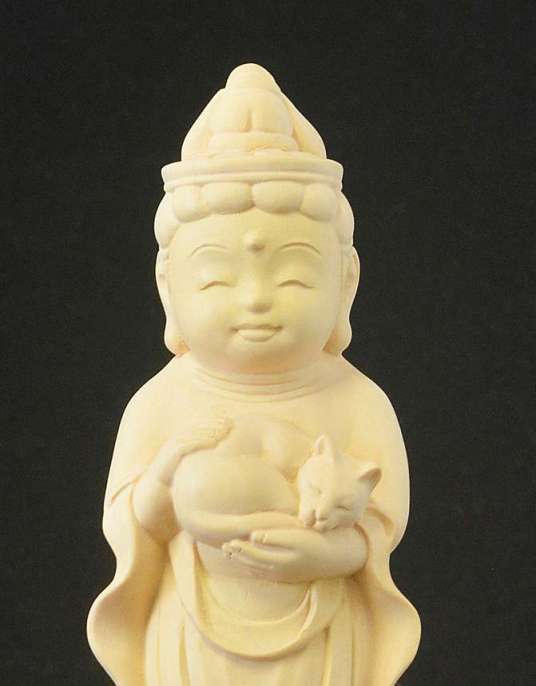 子犬と子猫を両手で抱っこするわらべ観音さまの木彫りです。 やさしい表情と繊細な彫刻に、思わず心がほっと癒されます。 わらべ観音さまの腕の中で甘える子犬と子猫を見ると、